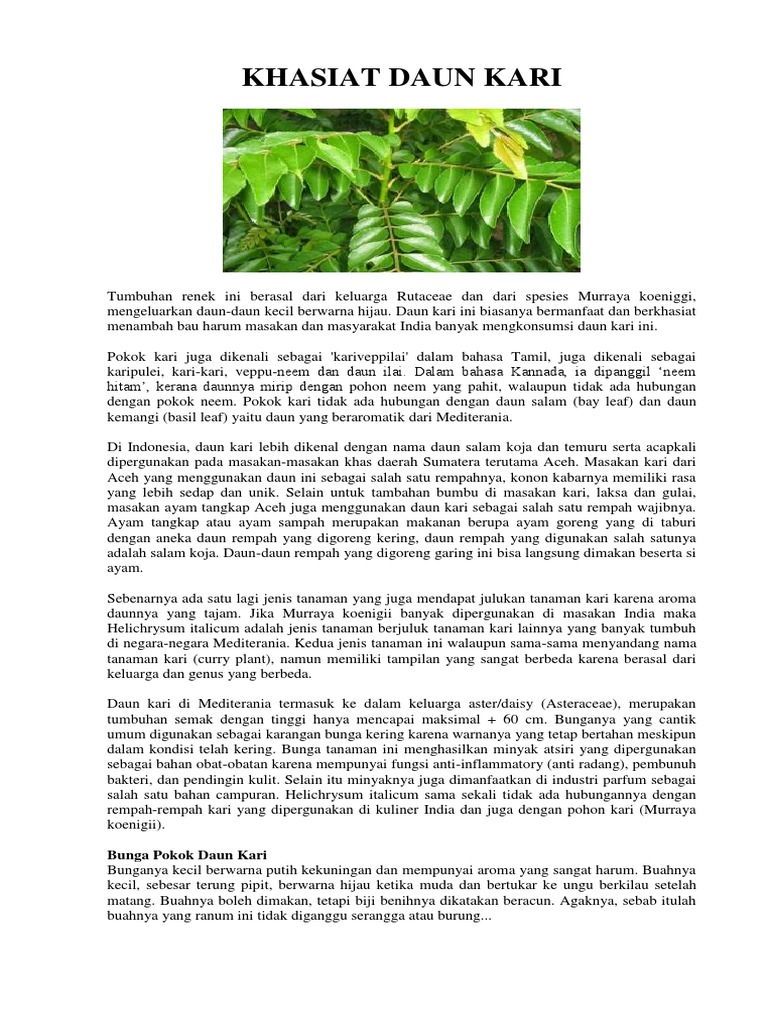 Khasiat Daun Salam Koja Gambar Daun Kari Korneliadayang Keposiasi from keposiasi.com Bunganya juga memiliki aroma yang khas. Daun kari mempunyai bau yang kuat dan rasa agak pahit. Kari ayam kuning ini cocok disantap dengan nasi hangat atau ketupat. Daun kari populer digunakan dalam masakan untuk menambah rasa pada masakan, seperti kari, nasi, dan makanan dengan rempah kuat lainnya. Kuahnya gurih wangi, makin segar ditambah daun kelor yang segar renyah. Daun kari merupakan jenis rempah asli india yang umum digunakan dalam berbagai masakan khas india dan srilanka, dengan aromanya yang begitu kuat serta penggunaannya hampir sama dengan. Tanaman yang satu ini, pewangi masakan orang melayu, memang sangat mudah. Some dishes are light and delicate infusions,orthers are robust and fiery concocitions,all are testimony.