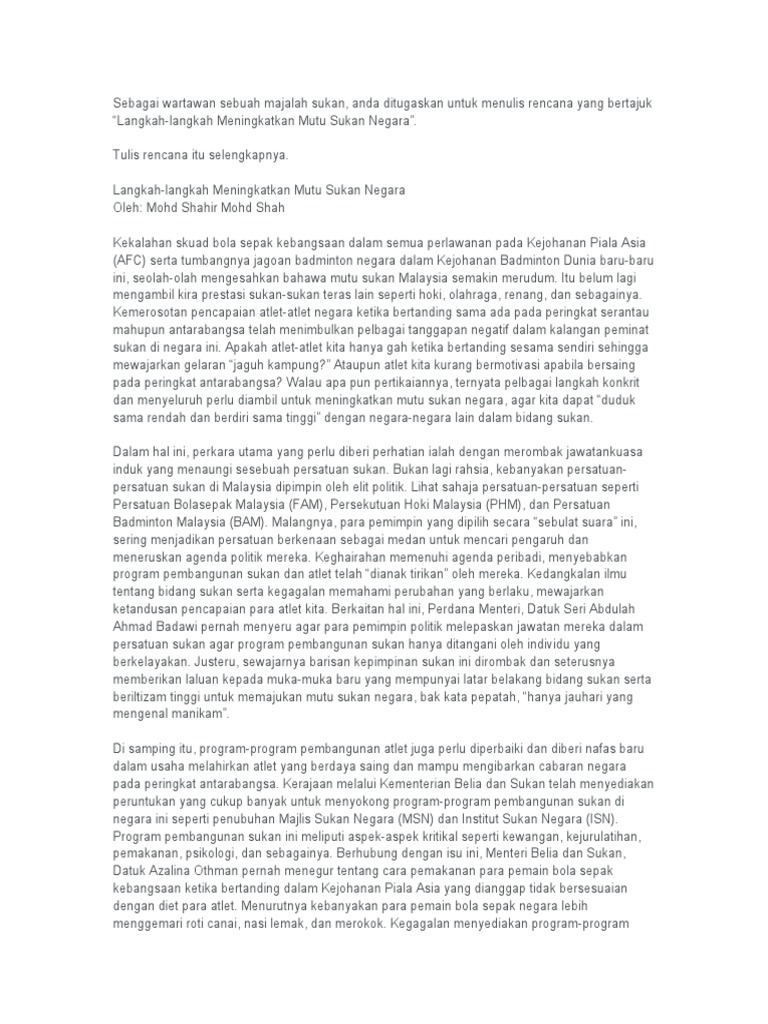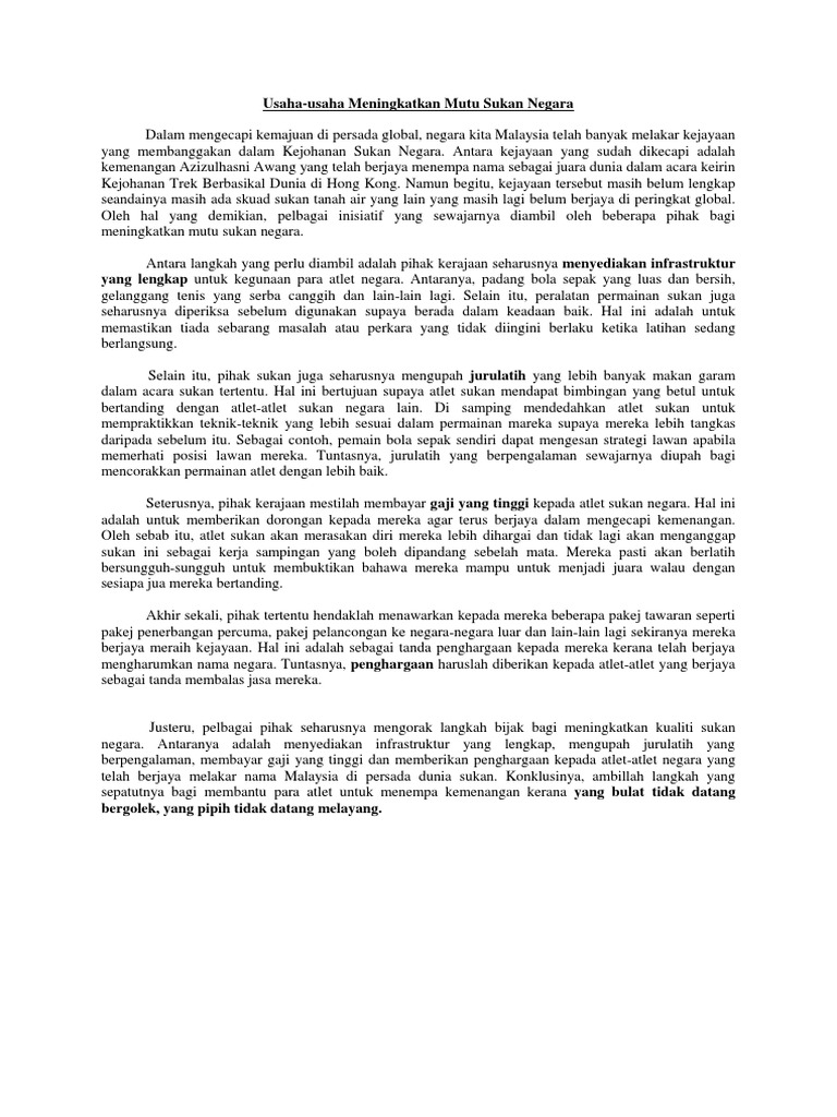 Sukankan Blog Galeri Peningkatan Mutu Sukan Negara from imgv2-2-f.scribdassets.com Kemenangan azizulhasni awang sebagai juara dunia dalam acara keirin kejohanan trek berbasikal dunia di hong kong telah membanggakan negara. See full list on ipendidikan.my See full list on ipendidikan.my Cuba kita lihat di kawasan berdekatan kita, adakah setiap dearah mempunyai kolam renang, padang dan balapan yang cukup sifatnya dan diselenggara dengan baik? Khidmat komuniti ini bukan sahaja menguntungkan komuniti setempat malah mampu mengangkat jenama syarikat swasta seperti cimb bank yang menaja indu. Di samping itu, kemajuan sains dan teknologi hari ini juga wajar untuk diaplikasikan dalam sukan di negara kita. By siardila519 november 28, 2014. Kementerian belia dan sukan boleh meningkatkan mutu sukan negara melalui metode membina kompleks sukan bertaraf dunia bagi memudahkan sesi latihan para atlet negara.